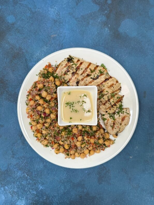Chickpea tabbouleh with grilled chicken is a flavorful and healthy Middle Eastern dish that is perfect for a quick and easy weeknight dinner. This dish is a great way to incorporate a variety of fresh vegetables and herbs into a satisfying and filling meal.