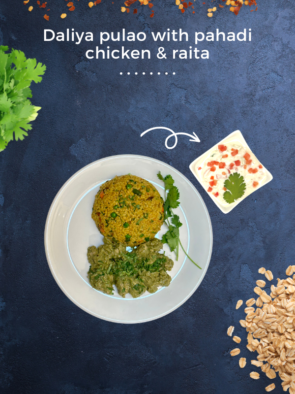 Dalia pulao with Pahadi chicken and raita is a wholesome and flavorful dish that brings together the goodness of broken wheat (dalia), succulent pieces of marinated Pahadi-style chicken, and a refreshing side of yogurt-based raita. This dish is popular in North India, especially in the hilly regions of Uttarakhand, where the Pahadi cuisine is known for its use of local ingredients and aromatic spices.