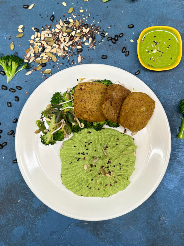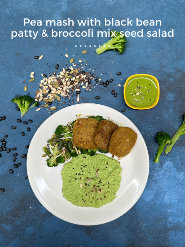 Pea mash with grilled chicken and broccoli mix seed salad is a healthy and delicious meal that consists of three main components: pea mash, grilled chicken, and broccoli mix seed salad. Here is a description of each component and the benefits of this meal: