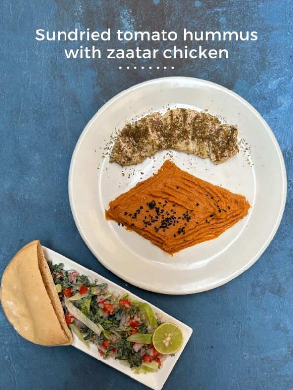 This sundried tomato hummus with zaatar chicken is a flavorful and satisfying dish that’s also healthy and easy to prepare. The creamy and tangy hummus pairs perfectly with the tender and juicy zaatar-spiced chicken, creating a dish that’s full of flavor and texture. This dish is perfect for a light and healthy lunch or dinner, or as a flavorful appetizer for a party or gathering.